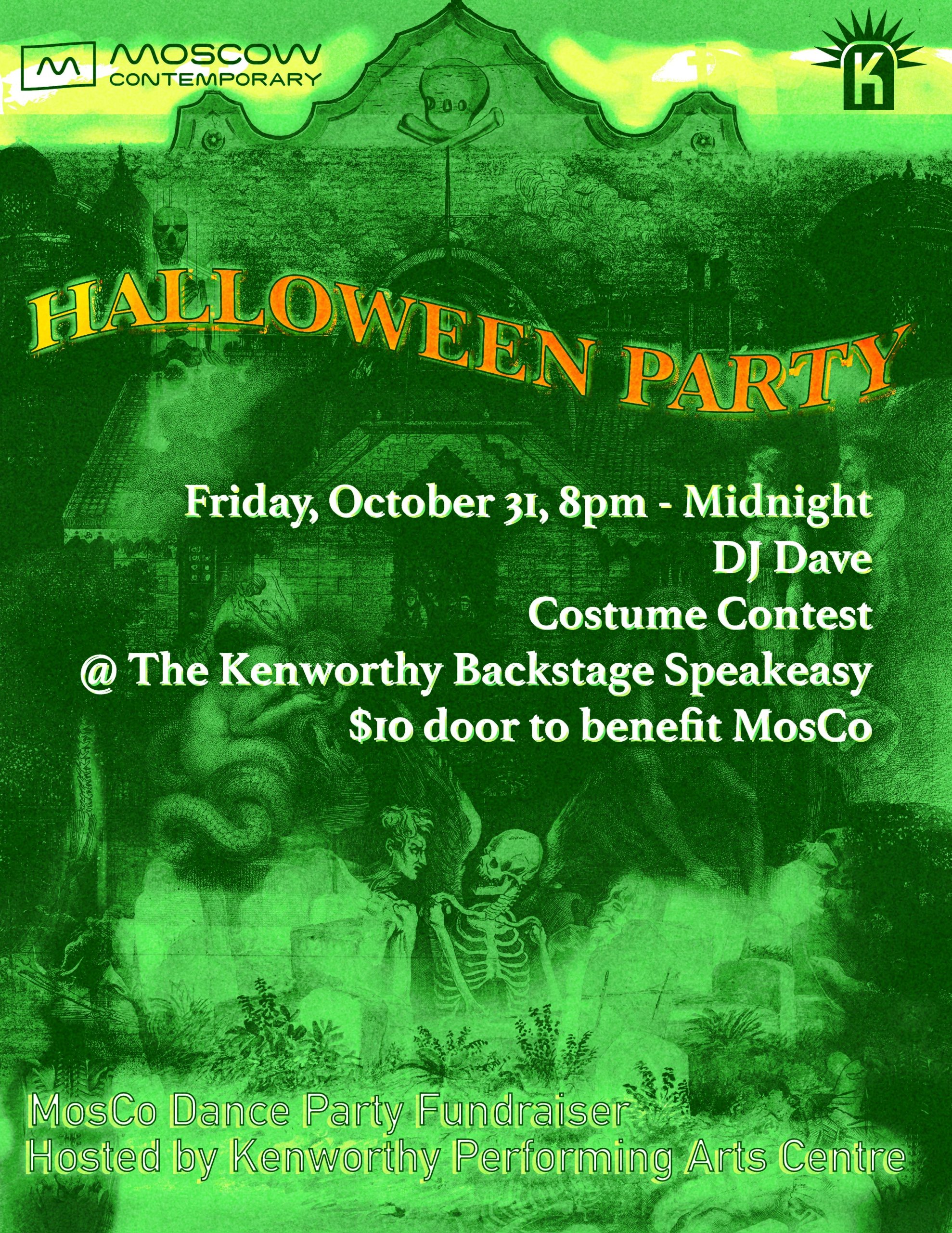 Moscow Contemporary & The Kenworthy Performing Arts Center presents a spoooooky evening at The Kenworthy Backstage Speakeasy $10 door to benefit Moscow Contemporary Doors 8:00 pm - Midnight Night includes costume party, DJ Dave, and a spookatucular celebration that will make you want to scream with ghoulish delight!