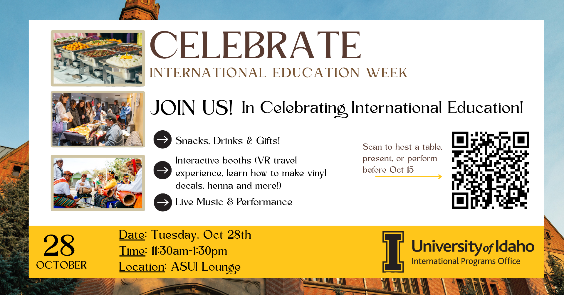 Join the University of Idaho International Programs Office for the International Education Week Celebration on Tuesday, October 28, from 11:30 a.m. to 1:30 p.m. in the ASUI Lounge! This lively event will feature cultural displays, henna art, live performances, calligraphy, VR travel experiences and more opportunities to experience the...