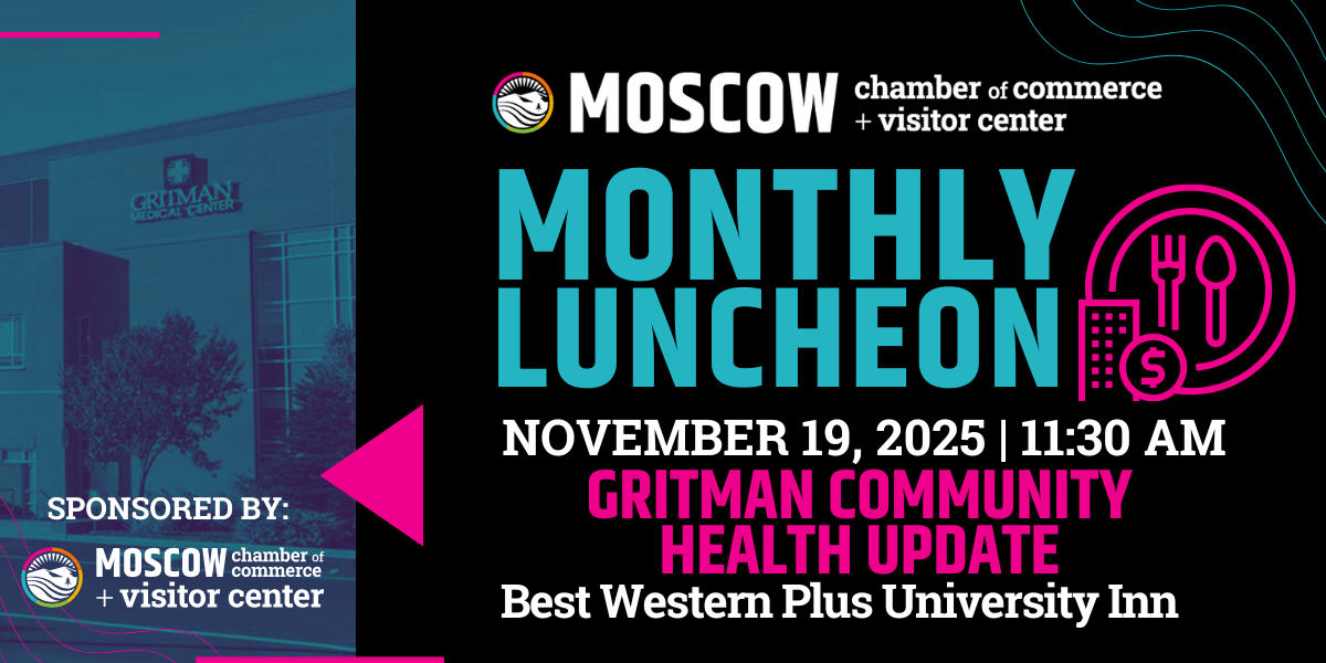 Join us for the November MCOC+VC Monthly Luncheon at the Best Western Plus University Inn to hear from Gritman Medical Center for a Community Health Update. All participants must register in advance. Register here: https://moscowchamber.com/luncheon-registration/ Schedule and Location 11:30 AM | Doors Open & Networking 11:40 AM | Food Starts...