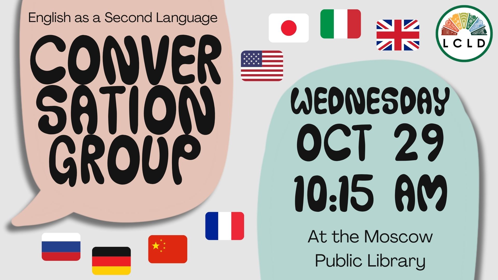 The Moscow Public Library is hosting an ESL (English as a Second Language) Conversation Group on Wednesday, October 29, at 10:15 am. We will kick it off with some games, then have some social time with iced tea, coffee, and cookies. Stop by for icebreakers and to get to know...
