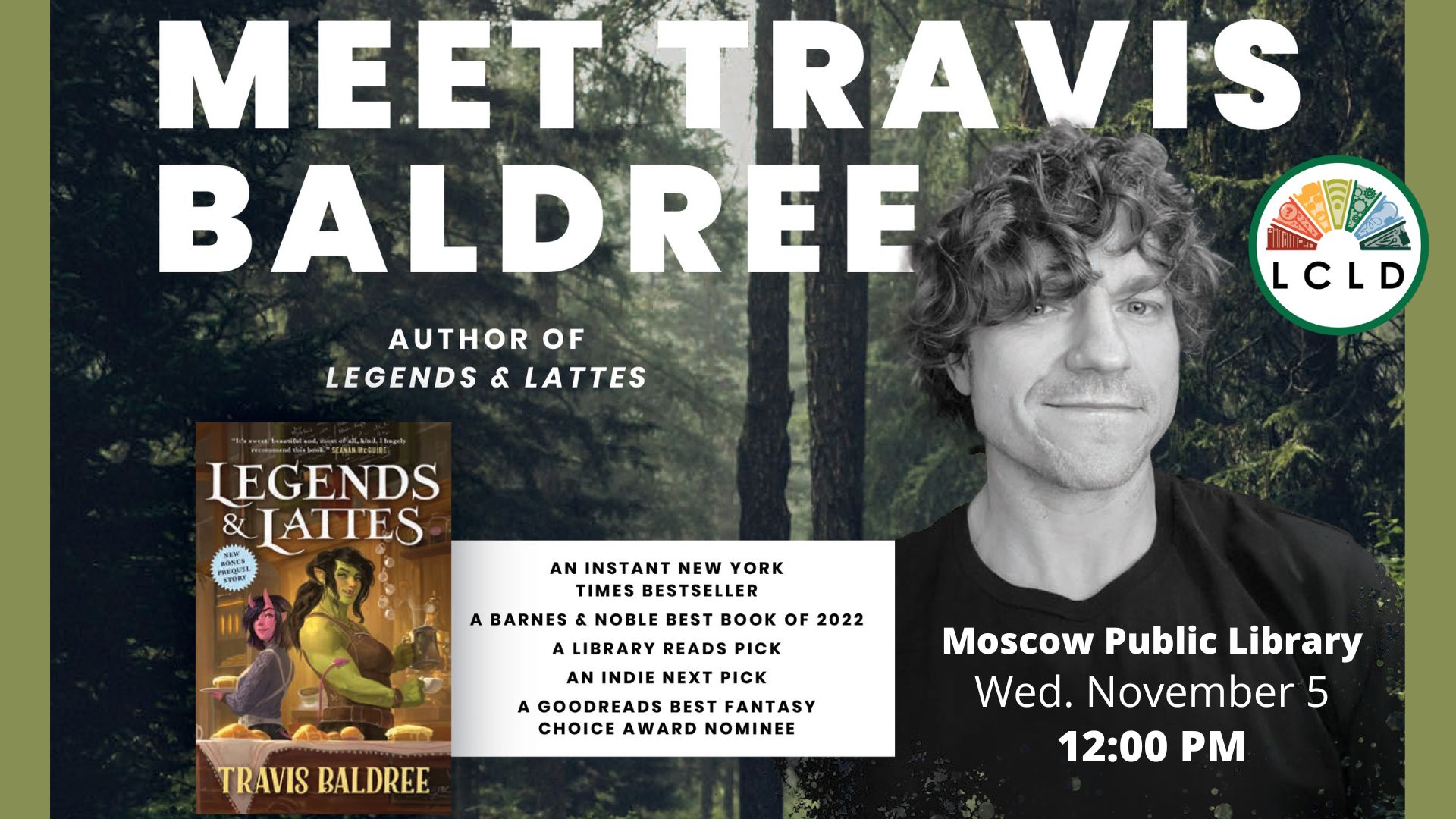 Join us for conversations with "Legends & Lattes" author Travis Baldree at the Moscow Public Library on Wednesday, November 5, at 12:00 PM. What happens when an orc warrior decides she’s ready for a fresh start? Add a dash of coffee, a sprinkle of cinnamon rolls, and a whole lot...