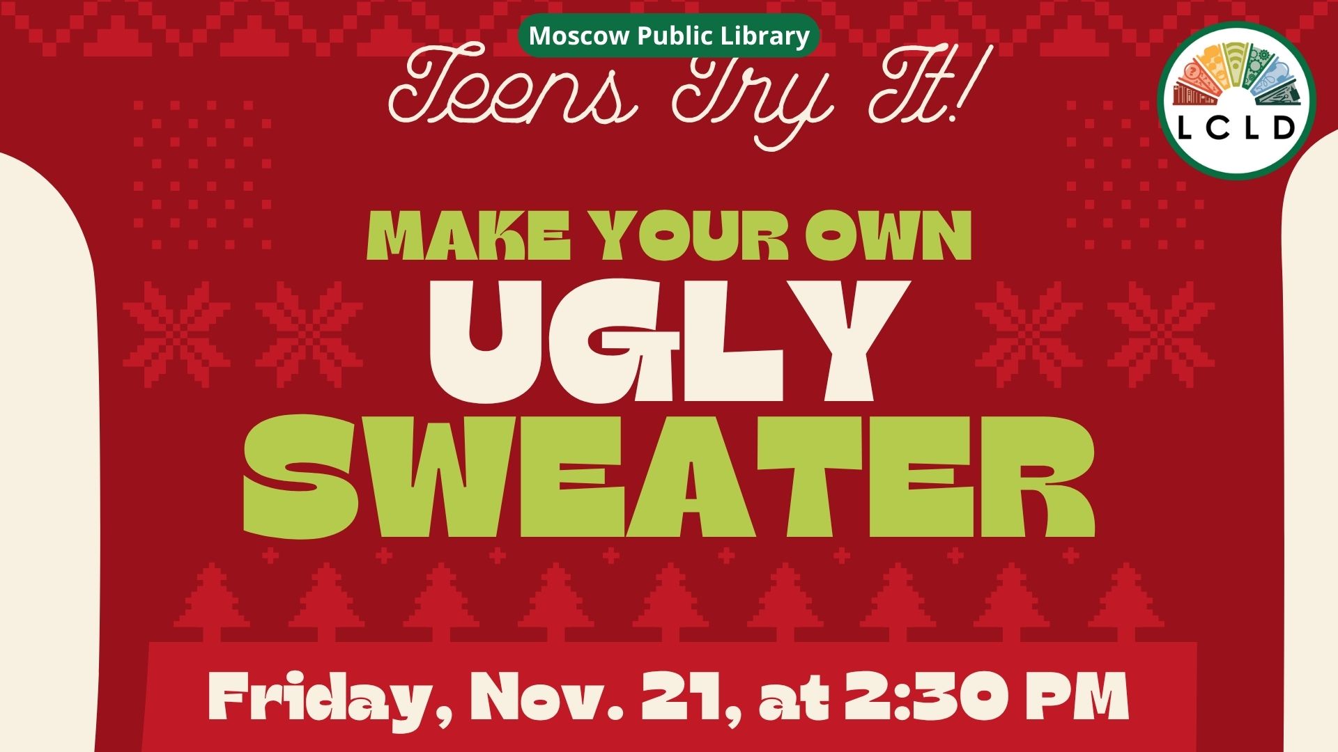 At Teens Try It!, teens are invited to the Moscow Public Library to learn and create with their peers. This month, teens will be making ugly sweaters to celebrate the upcoming holiday season! We hope to see you there on Friday, November 21, at 2:30 pm.