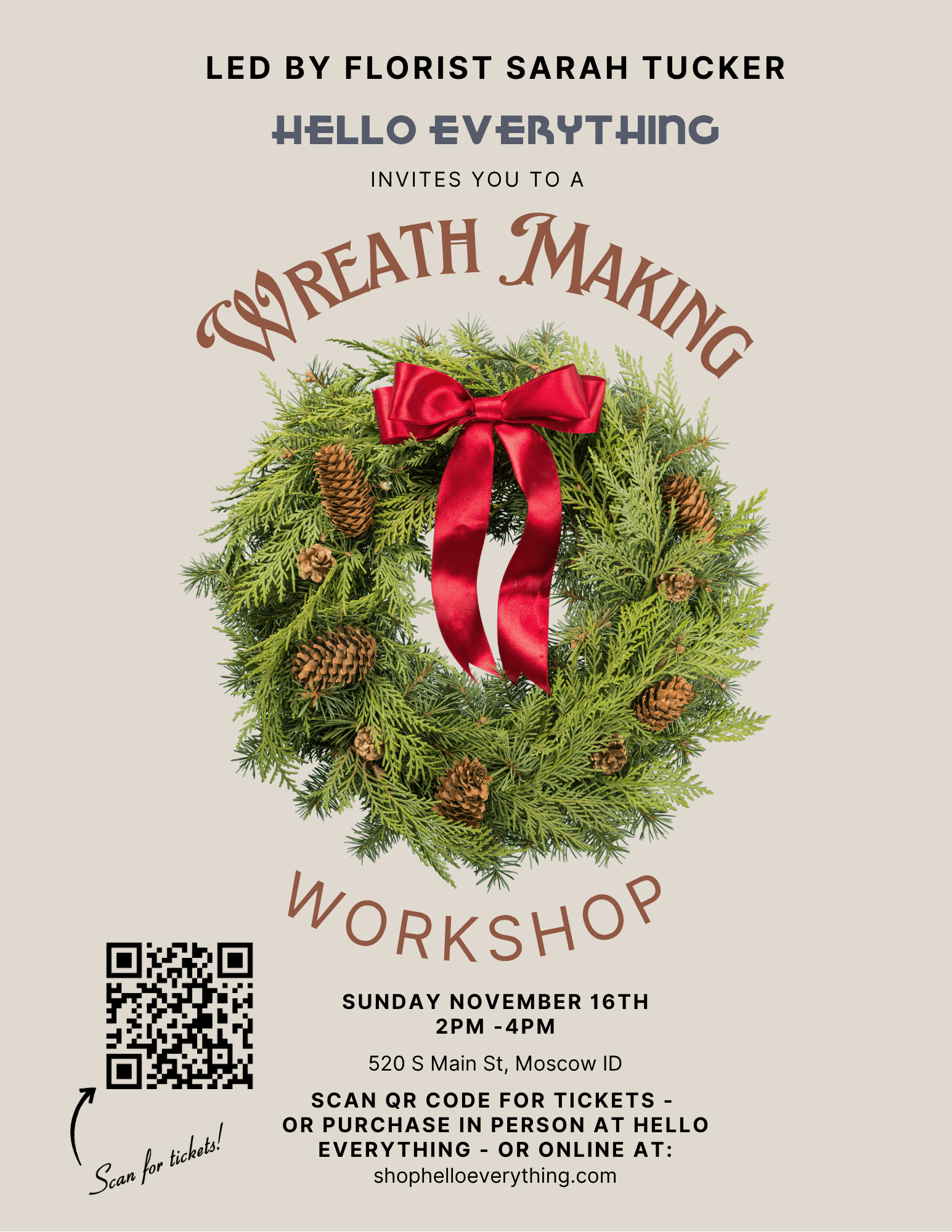 Hello Everything invites you to a Wreath Making Workshop! Sunday, November 16 2:00-4:00pm 520 S. Main Street Moscow, ID Purchase in person at Hello Everything - or online at: www.shophelloeverything.com