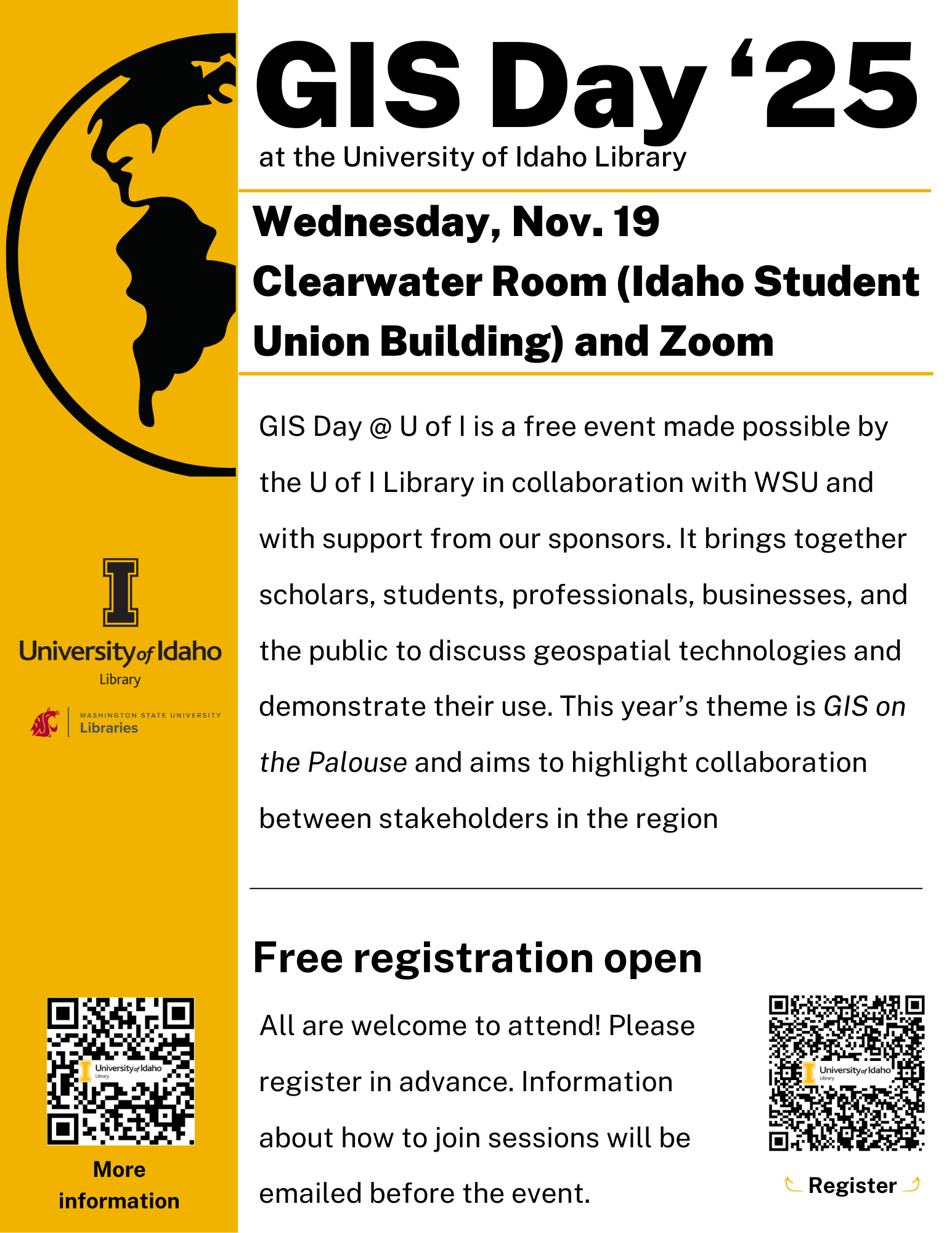 Join the U of I Library for GIS Day 2025 GIS Day @ University of Idaho is a free event made possible by the U of I Library, with support from our sponsors, that brings together scholars, students, professionals, businesses, and the public to discuss geospatial technologies and demonstrate their...