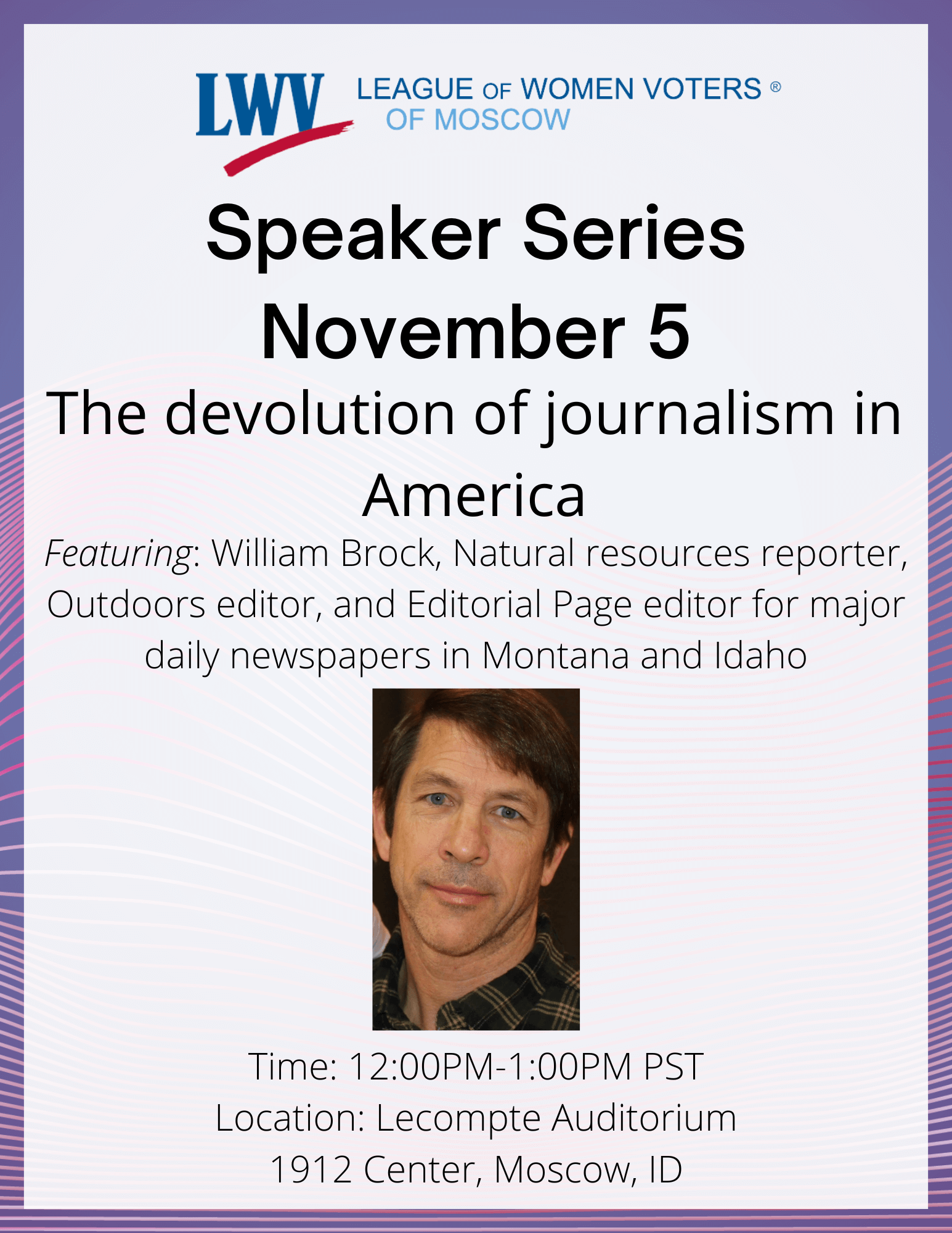 Join the LWV Moscow for a Speaker Series Presentation, The Devolution of Journalism in America, presented by William Brock on Wed., Nov. 5 at 12 p.m. in the 1912 Center Lecompte Auditorium. With the proliferation of electronic media in America, traditional journalism outlets face unprecedented economic challenges. Many are cutting...