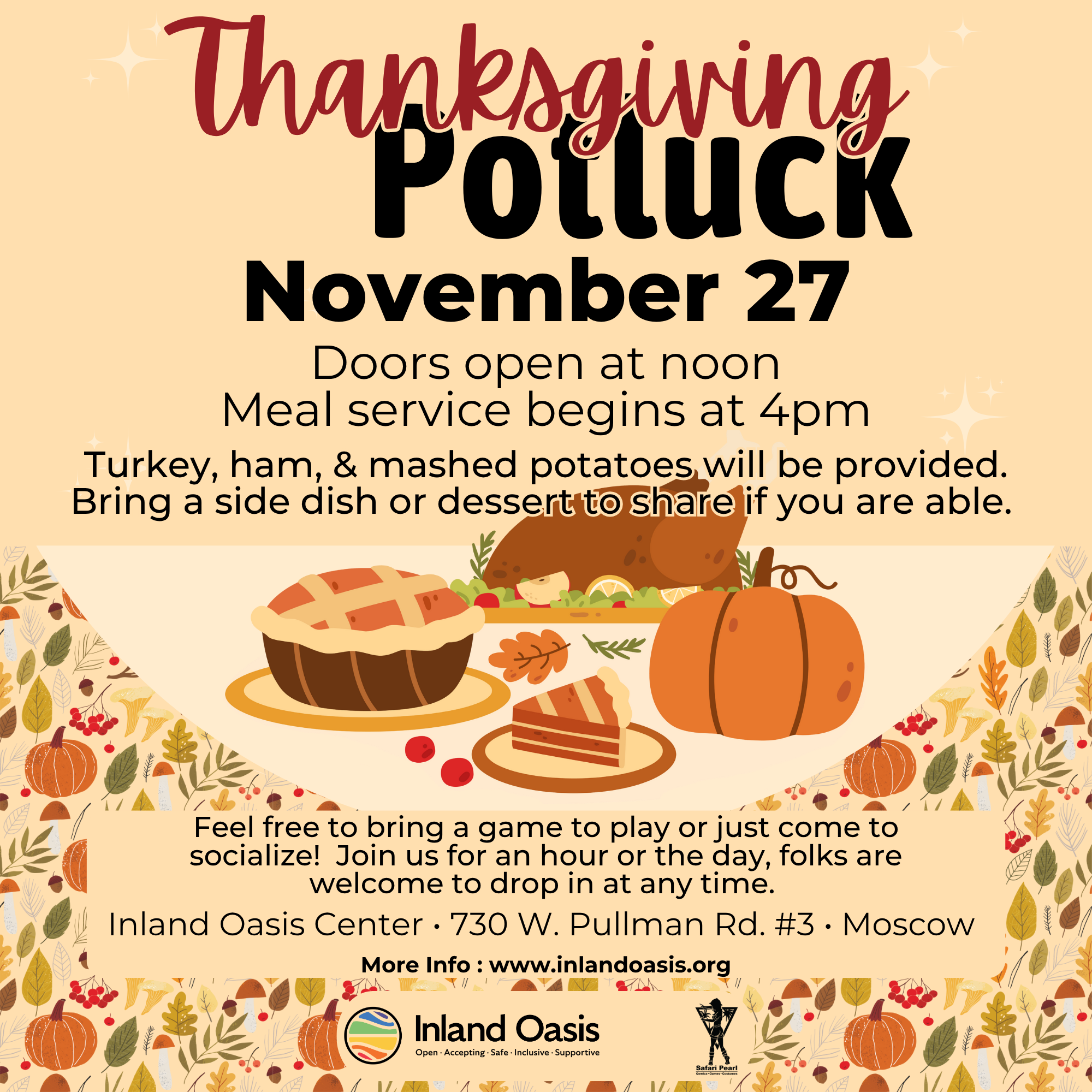 We are continuing the tradition of serving a Thanksgiving dinner with turkey and all of the trimmings. We will unlock the doors at Inland Oasis at noon for board games and snacks. We plan on serving the full meal at 4pm. We ask if you can, please bring a side...